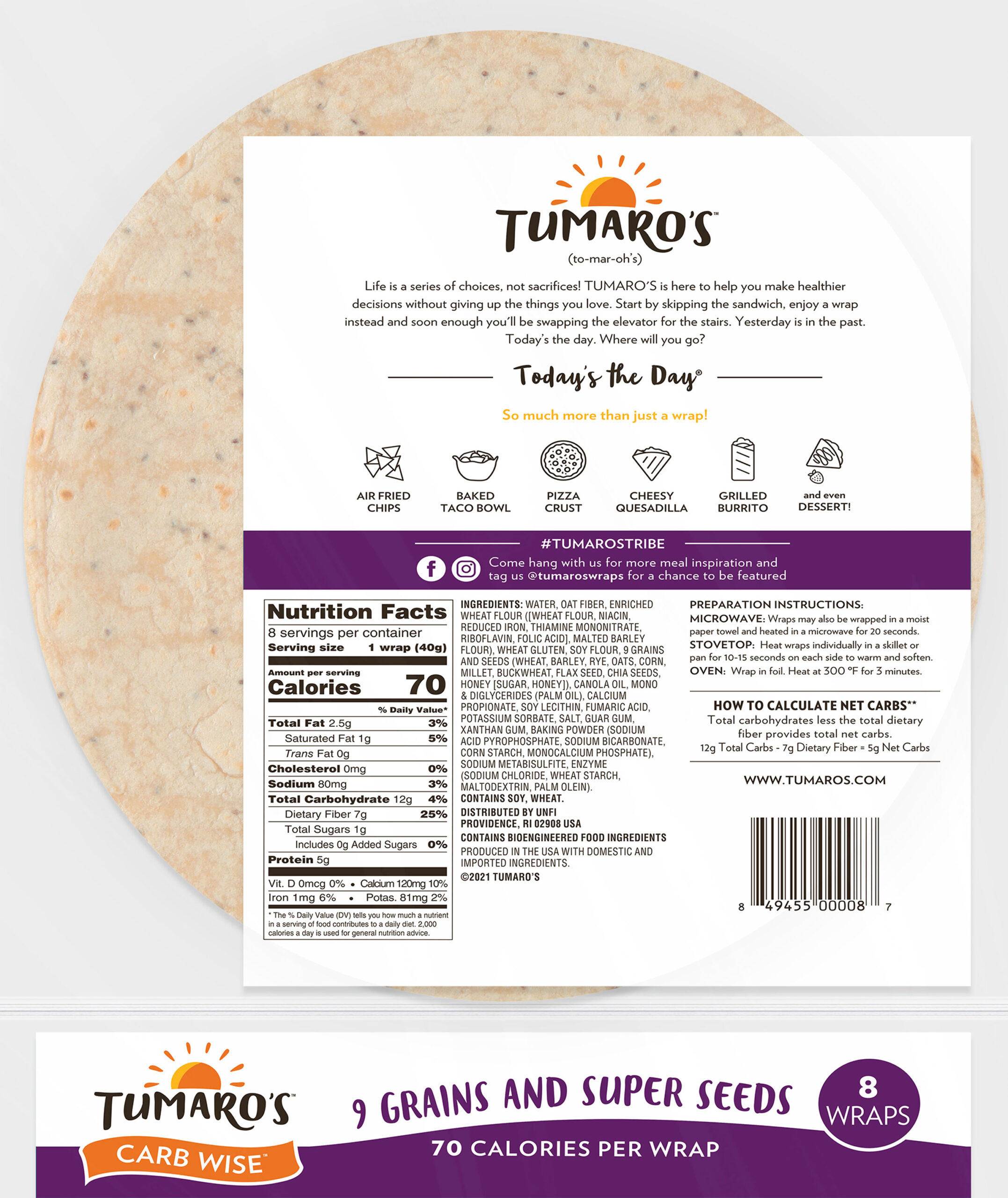Our wholesome and versatile Carb Wise™ 9 Grains and Seeds wraps are packed with a blend of nine grains and seeds, 25% of your recommended daily fiber intake. Plus, they have only 5 net carbs and 70 calories. Serve as a burrito, flatbread pizza crust, salad wrap, and more!