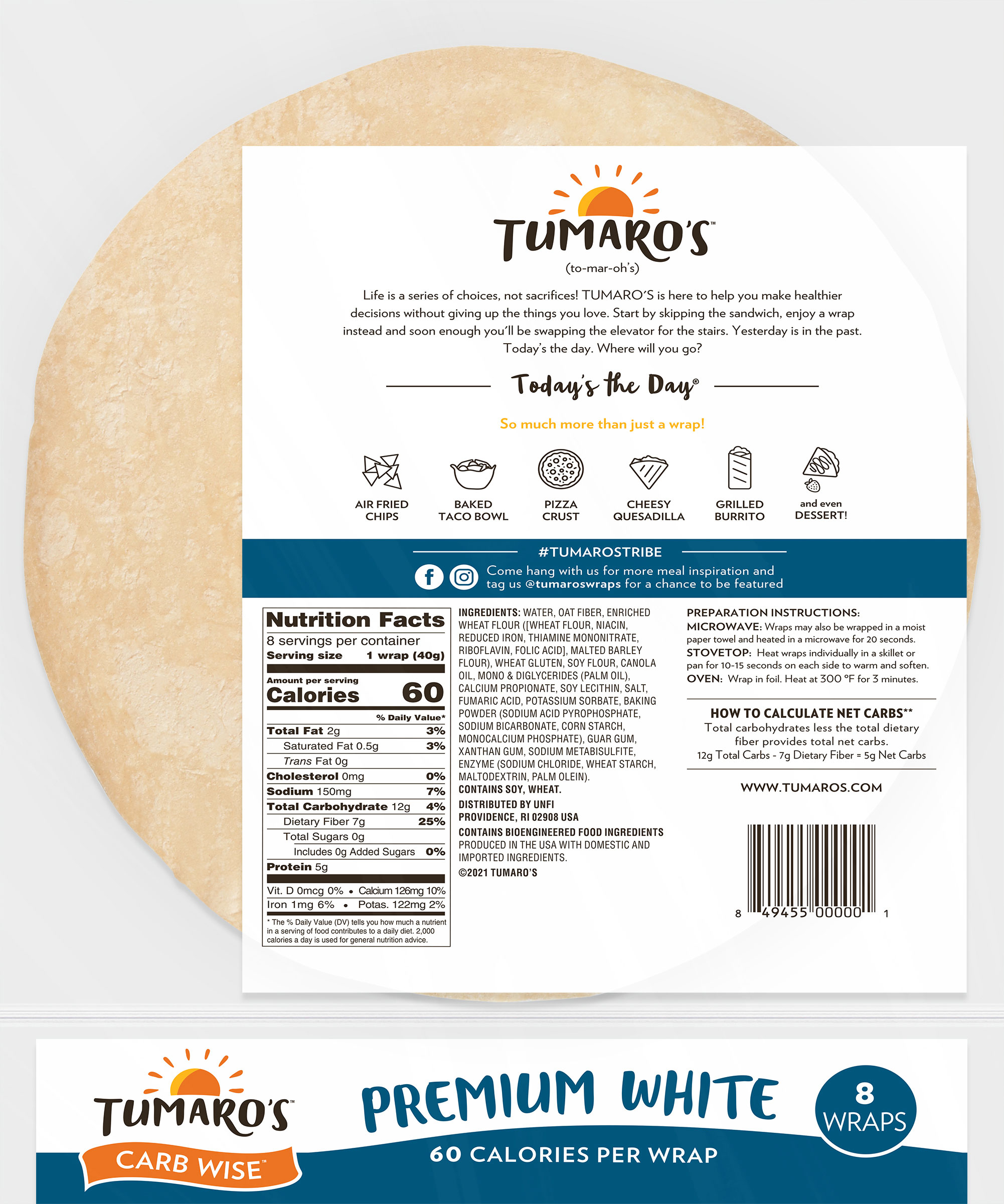 No matter what you’re counting, you can count on our Premium White Carb Wise™ Wraps to satisfy your cravings! Each wrap only has 5 net carbs and 60 calories with 7g of fiber per serving. So much more than just a wrap, try our premium wraps as a pizza crust, air fried chips, quiche, and even dessert!