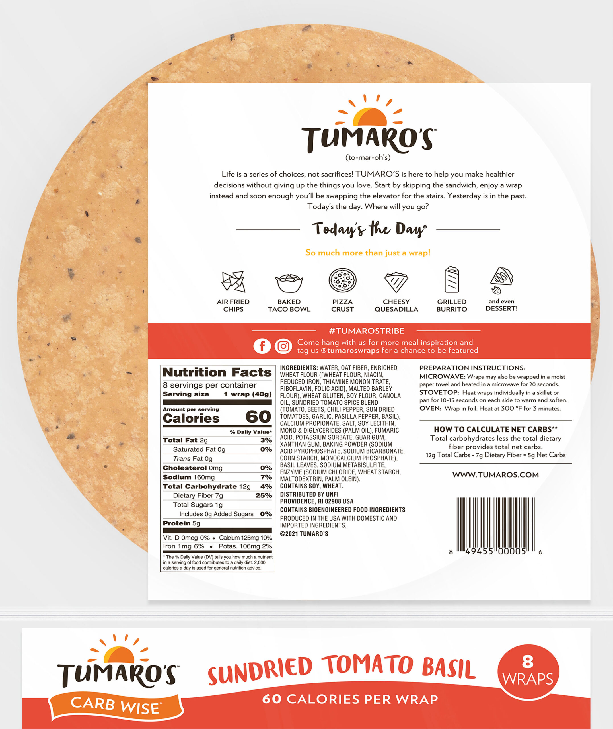 Find your zesty side with our Carb Wise™ Sundried Tomato Basil wraps! Packed with savory sundried tomatoes and basil flavor that turns up the tastiness all while keeping your carb goals low. Each wrap has only 5 net carbs and 60 calories. Now #thatsawrap!